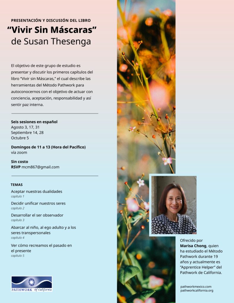The goal of this study group is to present and discuss in Spanish the first chapters of the book The Undefended Self, Living the Pathwork, which describes the tools of the Pathwork Method to get to know ourselves in order to act with awareness, acceptance, and responsibility — and thus feel inner peace.